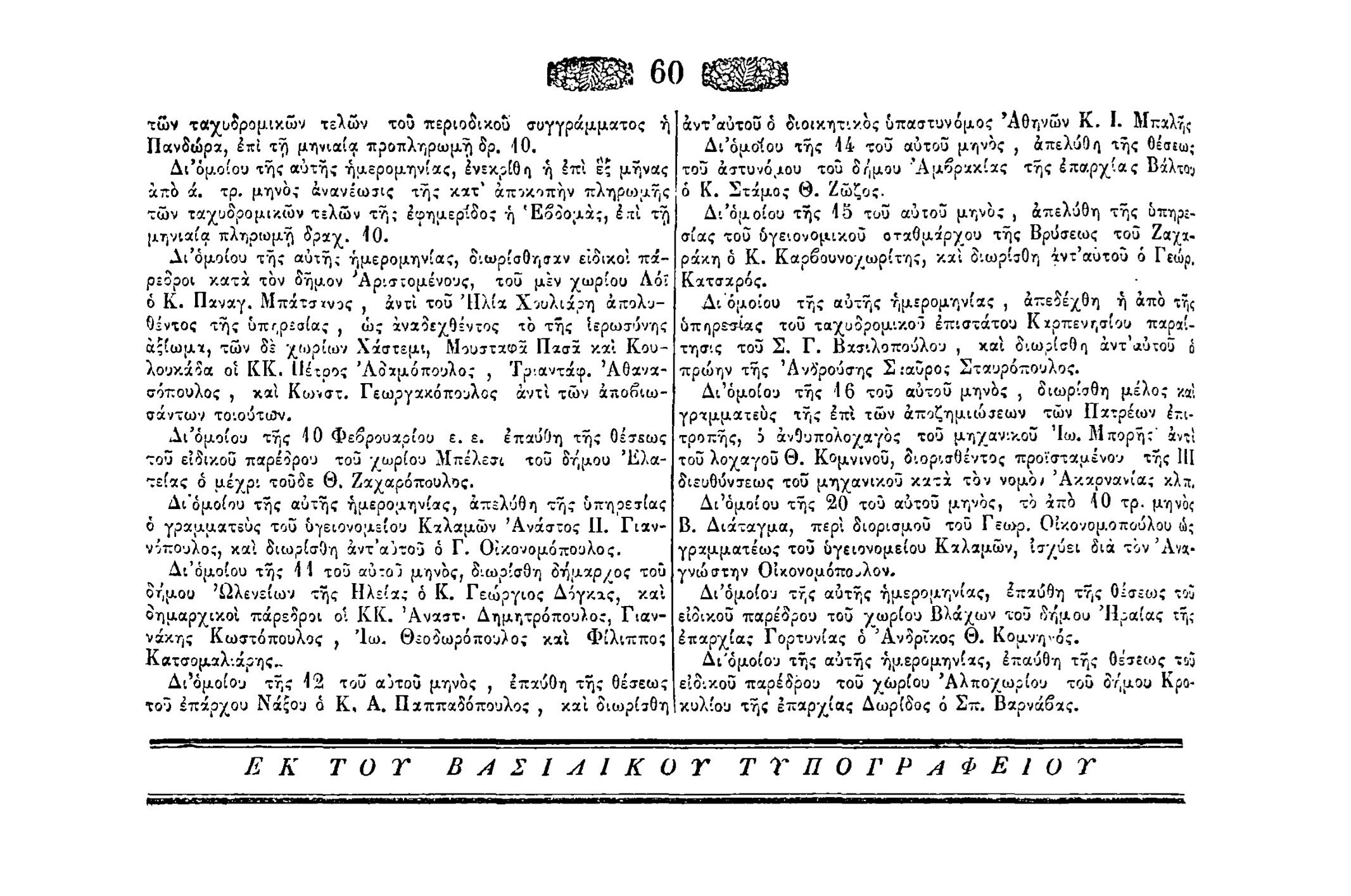 Στις 7 Μαΐου 1856, η Εφημερίδα της Κυβερνήσεως δημοσιεύει τους διορισμούς ειδικών παρέδρων του δήμου Αριστομένους: